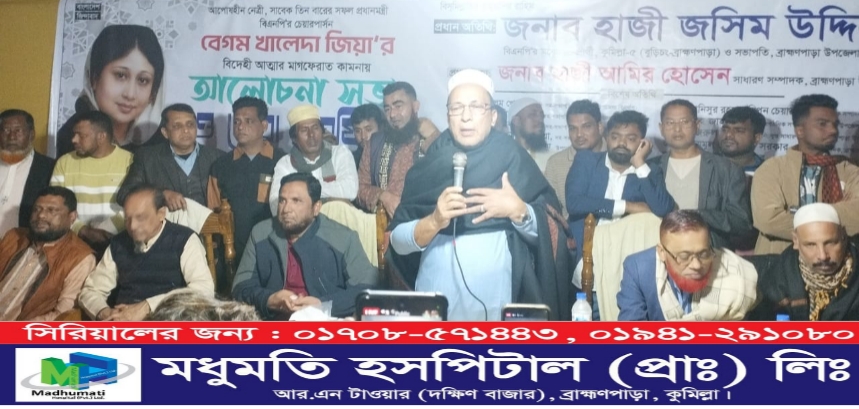 ব্রাহ্মণপাড়াঃ আগামীর রাষ্ট্র নায়ক তারেক রহমান ঘোষিত ৩১ দফার ভিত্তিতে বাংলাদেশ উন্নত রাষ্ট্রে পরিনত হবে বলে মন্তব্য করেছেন কুমিল্লা ৫- বুড়িচং- ব্রাহ্মণপাড়া আসনের বাংলাদেশ জাতীয়তাবাদী দল বিএনপির ধানের শীষের এমপি পদপ্রার্থী হাজী জসিম উদ্দিন৷ এসময় তিনি বলেন- বেগম খালেদা জিয়া অন্যায়ের কাছে কোন দিন মাথানত করেনি৷ হাজারো অন্যায়, নির্যাতন, মামলা, হামলার পরেও দেশ ছেড়ে যায়নি৷ তিনি সাবেক তিন বারের প্রধান মন্ত্রী ছিলেন৷ দেশের মানুষকে ভালবেসে দেশেই মৃত্যুবরণ করেছে৷ কিন্তু দেশ ছেড়ে পালায়নি৷ এ আপসহীন নেত্রীর সুযোগ্য সন্তান আগামীর রাষ্ট্র নায়ক তারেক রহমানের হাত ধরে বাংলাদেশ একটি সুখী ও সমৃদ্ধশালী উন্নত বাংলাদেশ গঠন হবে ইনশাআল্লাহ৷ তারেক রহমান একমাত্র নেতা যিনি দেশ কিভাবে চালাবে তার রুপরেখা আগেই ৩১ দফার মাধ্যমে সাধারণ মানুষের মাঝে পৌছে দিয়েছে৷ তাই আসুন সবাই মিলে আগামী দিনে বাংলাদেশ জাতীয়তাবাদী দলকে রাষ্ট্র ক্ষমতায় ধানের শীষে ভোট দিন৷ রবিবার ১১ জানুয়ারি বিকালে কুমিল্লা জেলার ব্রাহ্মণপাড়া উপজেলার মালাপাড়া ইউনিয়নের রামনগর এলাকায় সাবেক তিন বারের সফল প্রধানমন্ত্রী বেগম খালেদা জিয়ার আত্মার মাগফেরাত কামনায় দোয়া ও মিলাদ মাহফিলে প্রধান অতিথির বক্তব্যে এসব কথা বলেন কুমিল্লা দঃ জেলা বিএনপির সাবেক সদস্য সচিব, কুমিল্লা ৫ – বুড়িচং- ব্রাহ্মণপাড়া আসনের বাংলাদেশ জাতীয়তাবাদী দল বিএনপির ধানের শীষের এমপি পদপ্রার্থী হাজী জসিম উদ্দিন৷ মালাপাড়া ইউনিয়ন বিএনপির সভাপতি মোঃ সামছুল আলম ভূইয়া এর সভাপতিত্বে ইউনিয়ন বিএনপির সাধারন সম্পাদক ইউপি চেয়ারম্যান আবদুল্লাহ আল মামুন এর পরিচালনায় অনুষ্ঠানে প্রধান বক্তা হিসেবে বক্তব্য রাখেন ব্রাহ্মণপাড়া উপজেলা বিএনপির সাধারন সম্পাদক হাজী মোঃ আমির হোসেন, বিশেষ অতিথি হিসেবে উপস্থিত ছিলেন বুড়িচং উপজেলা বিএনপির সাধারণ সম্পাদক মোঃ কবির আহাম্মদ, সাংগঠনিক সম্পাদক মোঃ হুমায়ুন কবির বাবুল, ব্রাহ্মণপাড়া উপজেলা বিএনপির সহ-সভাপতি মোঃ শাহ আলম খোকন, সহ-সভাপতি মোঃ মহসিন কবির সরকার,সহ-সভাপতি সহ-সভাপতি মোঃ মাজহারুল ইসলাম ভূইয়া, জাহাঙ্গীর আলম ভূইয়া, যুগ্ম-সাধারণ সম্পাদক মোঃ নজরুল ইসলাম, যুগ্ম-সাধারণ সম্পাদক মোঃ শাহজাহান সাজু, যুগ্ম-সাধারণ সম্পাদক মোঃ এনামুল হক মাসুদ সরকার, সাংগঠনিক সম্পাদক মোঃ আনিসুর রহমান রিপন ভূইয়া,আইন বিষয়ক সম্পাদক এড. শাহজাহান, ছাত্র বিষয়ক সম্পাদক মোঃ জাকির খান সম্রাট, উপজেলা কৃষক দলের সভাপতি সাবেক ইউপি চেয়ারম্যান মোঃ মিজানুর রহমান, শ্রমীক দলের সভাপতি মোঃ আবু কাউছার, সাধারন সম্পাদক মোঃ কবির আহাম্মদ, উপজেলা ছাত্রদলের আহবায়ক মোঃ দিদারুল আলম ভূইয়া৷ বেগম খালেদা জিয়া 